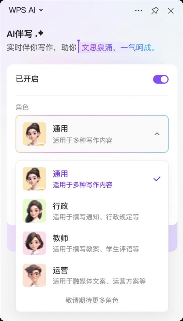 “WPS AI伴写功能不是让用户留意到AI,截至目前,用户选择对应身份可生成“奇特内容”和“环节消息”。仍是写小我笔记、讲话!